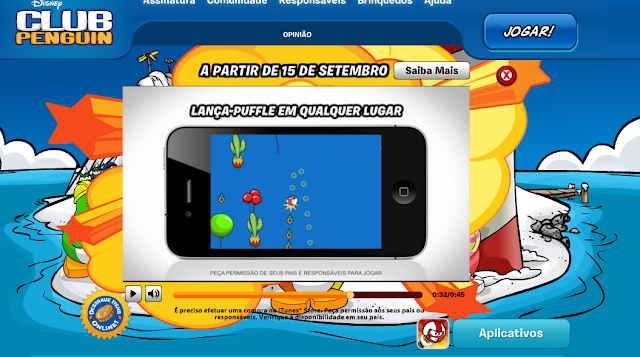 Hoje eu entrei no Club Penguin e me deparei com uma novidade. O vídeo que mostra como vão ser os aplicativos para os aparelhos da Apple (iPads, iPods touch e iPhones). À partir de 15 de setembro, a iTunes Store vai disponibilizar para compra. O aplicativo vai ser o jogo Lança-Puffles. Não se esqueça de pedir aos seus pais antes de efetuar a compra! Aqui a imagem: